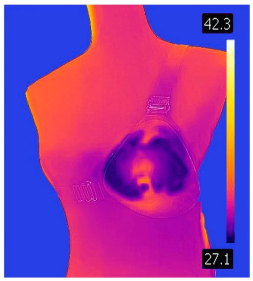 Figure 5 shows breasts on a 1.5 m high mannequin; 0.6 m chest and 0.4 m waist dimensions were used, as shown in Figure 1. Furthermore, different locations of cancer were defined and quantified using predefined X, Y, and Z coordinates, as shown in Figure 2. In this research, a FLIR One Pro thermographic camera, connected to a mobile phone, was utilized to monitor temperature variations on the silicone breasts’ surfaces. The FLIR One Pro is a thermal imaging camera that is designed to attach to a smartphone, allowing users to capture and analyze thermal images and videos. The camera uses a combination of thermal and visible light cameras to create images that highlight temperature differences in the scene. The thermal camera has a temperature range of −4 °F to 752 °F (−20 °C to 400 °C) and a thermal sensitivity of 70 mK, and it can detect temperature differences as small as 0.18 °F (0.1 °C). The camera has a resolution of 160 × 120 pixels, with a thermal pixel size of 12 µm, frame rate of 8.7 Hz, focus range of 15 cm–infinity, a wavelength spectral range of 8–14 µm, and a field of view of 55 degrees. The FLIR One Pro also includes features such as adjustable thermal span and level, as well as FLIR’s patented MSX technology, which overlays visible light details onto thermal images to provide additional context [29]. Additionally, the infra-red camera recorded the temperature profiles of a silicone breast every 5 min, and these images can be downloaded onto a PC. In addition, the room temperature was kept between 22 °C and 26 °C while using situ-cooling gel. The distance between the FLIR camera and the breast was 1 m. Finally, tumor size was set to 1 cm and located at different positions in the breast, with depths of 2 cm, 3 cm, 4 cm, 5 cm, 6 cm, 7 cm, 8 cm, 9 cm, and 10 cm.