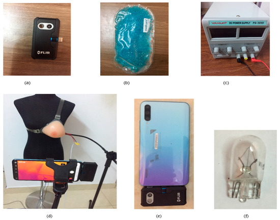 Materials used: (a) FLIR One Pro thermal camera, (b) cooling gel, (c) DC power supply, (d) 1-m distance between the breast and the thermal camera, (e) FLIR One Pro connected to mobile phone, and (f) lamp (12 V, 5 W) with 1 cm Diameter.