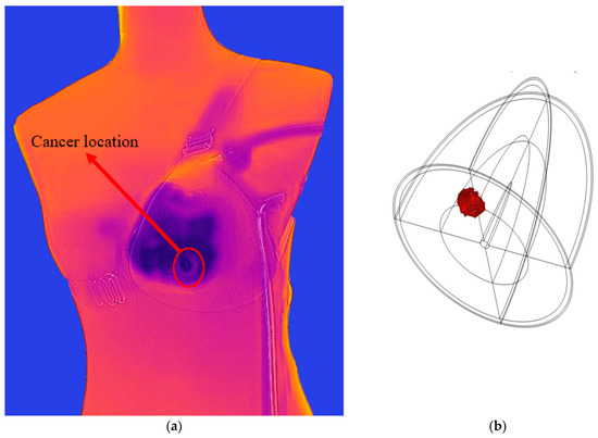 The researcher in [19] simulated breast cancer in terms of tumor size and location in the breast, using the COMSOL software. In addition, the Pennes bioheat transfer equation and artificial networks were used to achieve high detection accuracy. In addition, heat was generated to simulate the tumor in two models. The first generates a constant temperature and the second generates variable heat, thereby generating 447 temperature data vectors in each case. Moreover, different values of noise were added to thermal images. The results indicated that the detection accuracy of breast cancer is 98% using artificial intelligence networks. In addition, given that the breast thermogram is within 0.1 noise levels, a neural network approach can be adopted to retrieve the tumor location and radius with reasonable accuracy. The study’s main goal in [20] was to identify and calculate the geometric centers of breast tumors using skin surface temperatures. To determine the distribution of skin temperature among the three main forms of breast cancer, the 2D anatomical geometry of the breast was simulated using COMSOL software. However, the simulated temperature values included 2% of errors. Additional temperature profiles were obtained without any prior information on the tumor’s thermophysical characteristics or the exception of the average values of thermal conductivity and perfusion of layers of healthy breast tissue. The results showed that the error rate of tumor location was 0.32 cm.