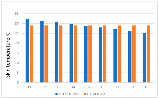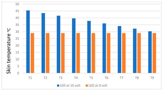Figure 6 shows the above-mentioned mannequin measurements while simulating the level of the human chest. In addition, a silicone breast, 17 cm in length, was used. In addition, a lamp with a 1-cm diameter was utilized to simulate the tumor (12 volts and 5 watts) and connected to a DC power supply to change voltage values on a set of different measurements. Internal sensors were placed with the tumor and on the breast’s surface to record temperature values with voltage change. However, two holders were used (one to hold a lamp inside the breast according to the required coordinates and the other to hold the thermal camera. Additionally, a thermal camera was placed one meter away from the mannequin, and a cooling gel with an area of 50 cm was added to cool the surface of the breast.