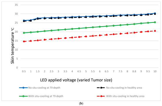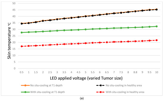 - Second, the observed experimental temperature difference values were maintained throughout the experiments, regardless of the tumor size (e.g., voltage applied). This is true for both cases with and without situ-cooling and for any tumor depth (see Table A1 in the Appendix A). The latter situation can probably be resolved using a higher resolution thermal camera sensor.