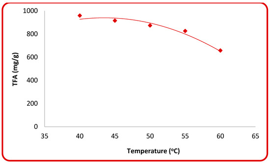 The graphical representations of the total amount of fatty acids released by lipid hydrolysis against the pH and the temperature are displayed in Figure 1 and Figure 2, respectively. They allow us to clearly appreciate how, for pH greater than 8.0 at 50 °C or temperatures above 50 °C at pH 8.0, there are no significant variations in the amounts of fatty acids obtained that justify the additional cost of reaching higher quantities of fatty acids.