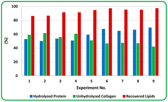 The results obtained show how high pHs and low temperatures favor hydrolysis, producing hydrolysates with a higher percentage of hydrolyzed protein and a lower percentage of unhydrolyzed collagen (Table 2 and Table 3).