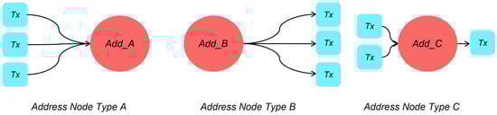 In the heterogeneous information network of Bitcoin transactions, Bitcoin transaction entities and Bitcoin wallet addresses are represented by nodes in the graph structure. In the anti-money laundering detection of Bitcoin, we aim to detect the legitimacy of the transaction node, so we mark the transaction node as . In addition, we further divide the wallet address node into three categories by analyzing the characteristics of the wallet address participating in the transaction, as shown in Figure 3.