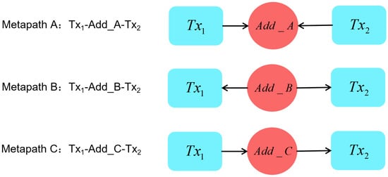The metapath describes the relationship between two transaction entities and the shared wallet address. In this framework, depending on the division of wallet address types in Section 3.4, we use Algorithm 2 to define three metapath types to distinguish the subtle differences in Bitcoin transactions in detail, as shown in Figure 4.