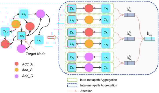(3) Through experiments, we proved that building a heterogeneous transaction network model based on the metapath aggregated graph neural network (MAGNN) [] helps improve the performance of detecting Bitcoin money laundering for the same Bitcoin transaction behavior. Also, the model can be considered a baseline method for the heterogeneous network dataset. It provides more possibilities for future research perspectives.