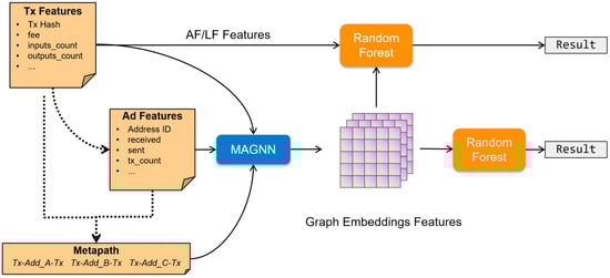 There are many studies on Bitcoin anti-money laundering, including work on using well-known supervisory learning models, such as support vector machine (SVM) [], random forest [], and XGBoost []. However, due to the simple structure of the model, it cannot capture the information in the Bitcoin transaction network structure, so it has a poor effect on money laundering detection.