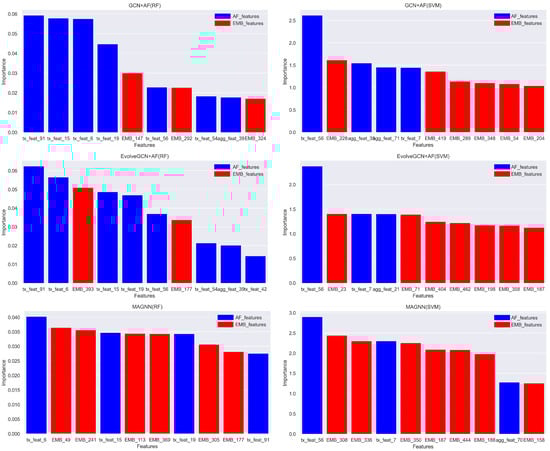 The feature scores are plotted as bar graphs, distinguishing the two feature classes by color, i.e., blue for the original AF features and red for the graph embedding features obtained through graphical representation learning. We selected the embedded features of the GCN, EvolveGCN, and MAGNN models to join with the original AF features for the experiments, as shown in Figure 8.