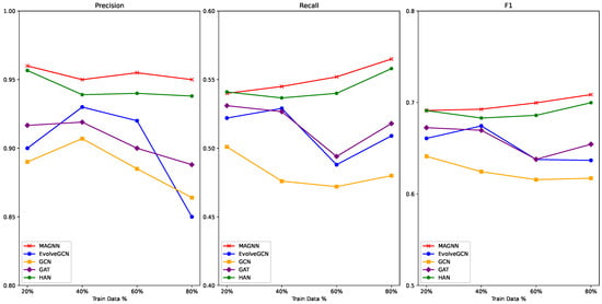 We found that after increasing the training data size, the MAGNN and HAN model slightly improved in recall and F1 scores. At the same time, the precision of GCN, GAT, and EvolveGCN continuously decreased with the increase of training data, and the change range of each score was large and unstable. Therefore, we believe that as heterogeneous graphs, MAGNN and HAN are robust and have the advantage of detecting small numbers of samples in unbalanced datasets.