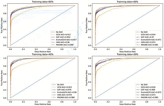According to the ROC curves and AUC score, the embedding features obtained by MAGNN outperforms the other models in all training data sizes. It can, therefore, be speculated that MAGNN has good model generalization ability and robustness on unbalanced datasets.