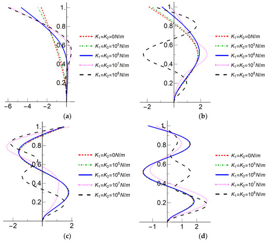 Modal shapes of VNA system with different constraint stiffness. (a) First mode shapes; (b) Second order mode shapes; (c) Third order mode shapes; (d) Fourth order mode shapes.