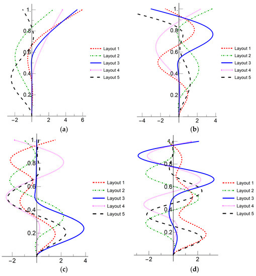 The first four-order natural frequencies and vibration mode function curves under different layout schemes can be obtained through the DTM method, as shown in Table 3 and Figure 4.