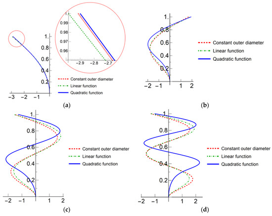 Modal shapes of VNA system with different outer diameter function. (a) First mode shapes; (b) Second order mode shapes; (c) Third order mode shapes; (d) Fourth order mode shapes.