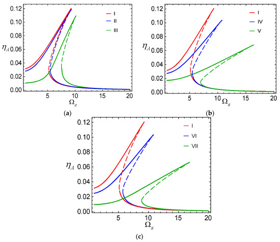 Relationship between vibration amplitude of VNA system and excitation frequency under different constraint types. (a) Amplitude frequency response of Ⅰ, Ⅱ and Ⅲ; (b) Amplitude frequency response of Ⅰ, Ⅳ and Ⅴ; (c) Amplitude frequency response of I, VI, and VII.