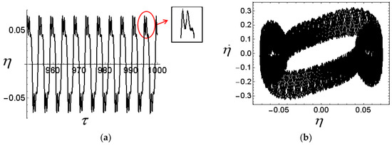 In order to simplify calculations and provide design optimization ideas, this chapter simplifies and adjusts the working conditions. The design working condition combination remains unchanged. The once-in-a-century wind speed load is , and the OBE seismic load is from the nuclear power ACP1000 reactor type using a standardized design. On the basis of eight foundation section parameters, the ground action peak value is 0.1 g, and the frequency is widened by 15%. The seismic response spectrum obtained from the calculation result envelope value is taken. Here, the basic acceleration excitation is simplified for convenience of calculation, . The basic excitation contains five frequency components, corresponding to the first to fourth order resonant frequencies and non-resonant frequency components of the system, , , , , . is the acceleration excitation amplitude corresponding to each frequency component, , , , , . is the mass fraction of each frequency component of the base acceleration excitation, , , , , , and the sum of them is 1. Due to the high wind speed in the external flow field, it is not within the frequency locking region of the system’s vortex induced vibration. Based on modal truncation analysis, it is easy to know that when considering the combined effects of vortex induced vibration and foundation excitation, the fourth order modal truncation should be selected for analyzing the vibration response of the VNA system structure. In this section, the Runge-Kutta method is used for numerical calculation of Equations (26) and (27), and the initial value of the calculation is 0. The physical parameters are shown in Table 1. The linear and nonlinear stiffness values of the elastic constraint are taken as 103 N/m and 103 N/m3. The dimensionless flow velocity in the pipe is taken as 0.5, regardless of structural damping, and the elastic constraint damping coefficient is 0.3 N/(m/s). The time history response curve and phase diagram of the free end of the VNA system structure can be obtained through calculation, as shown in Figure 9.