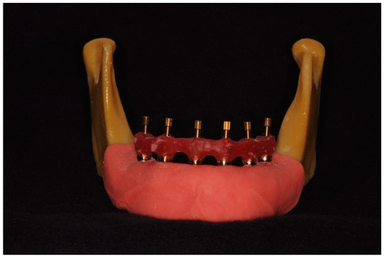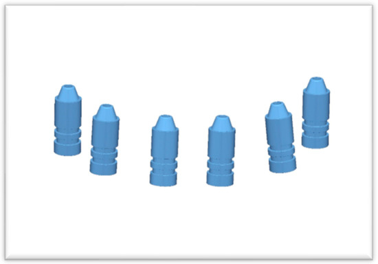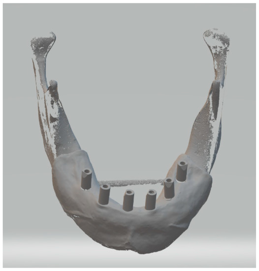 Six Straumann bone-level 4.1 implants, each with an internal hexagonal connection (Institut Straumann AG, Basel, Switzerland) and the corresponding screw-retained abutments (SRA) (Institut Straumann AG, Basel, Switzerland), were placed in an artificial mandibular with artificial gingiva, simulating a clinical situation. A 12-megapixel reference scanner was used to scan the master cast (Gom Atos Compact Scan 12 M, GOM Metrology, Braunschweig, Germany). The scan was stored in an STL file and considered the digital master cast (Figure 1).