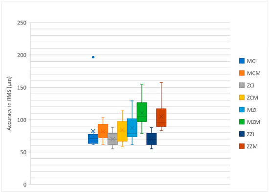 Accuracy (RMS ± 95% CI) in µm between each group and the master model.