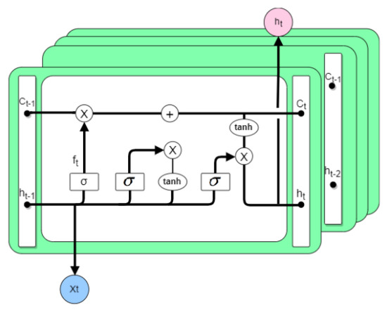LSTM is an improved recurrent neural network that is used to extract temporal information and characteristics during processing. A structural diagram of the LSTM network is shown in Figure 3. In comparison to RNN, LSTM incorporates memory cells with a forgetting gate method, allowing for selective memory and the filtering out of noise information, thereby reducing the memory burden.