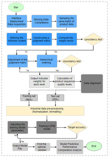 The processes for each detection stage are displayed in Figure 1, the information for which was obtained by navigating the gateway data of the water dispenser manufactured by QIXI Intelligent Technology Co., Ltd., (Ningbo, China). The quality level was assessed with 500 drinking fountains manufactured continuously on the same production line, and the quality divergence points were determined by extracting the semi-finished product stage data from the supply chain and manufacturing execution system of the production line. Generally speaking, the LSTM model is only capable of reflecting changeable time-series dynamic characteristics; it cannot extract quality features. Fuzzy theory is used to extract the quality features at this stage. Since the export of real-time data begins with a starting file that is primarily written in JSON format, we must process each variable to ease the process for a later input model. Once the data had been traversed, we tested the semi-finished water dispenser, including with respect to power, current (using the PCA Current test), voltage (using the PCA Voltage test), flow output, and leakage current. Missing defaults were assessed using the interpolation method for completion. There are many reasons for missing data, which may be caused by human or sensor failure, and the specific methods can be found in [27].