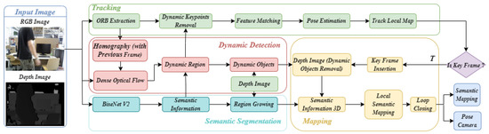 For the effect of dynamic objects on vSLAM, a semantic information-based optimized vSLAM is proposed with ORB-SLAM2 [8] as the base framework. In the process of frame matching, in order to improve the accuracy of pose estimation in dynamic sceneries, the detection of dynamic regions that are based on homography matrix and dense optical flow methods are used to remove feature points in dynamic regions. In the process of mapping, the semantic information in the image is obtained using the deep learning method. Then, a region growing algorithm combined with depth information is used to improve the accuracy of object semantic segmentation. Finally, the 3D information of dynamic objects is removed using semantic information and dynamic region detection to avoid building dynamic objects into the map. The main contributions of this paper are as follows:
