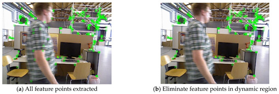 Dynamic objects usually affect the inter-frame pose estimation and mapping of vSLAM systems. The matching relationship between feature points on dynamic objects is usually an important factor that causes pose estimation errors. Wei et al. [19] combined a GMS feature point matching method with a k-means clustering algorithm to reject feature points on dynamic objects. Yang et al. [20] cluster regions in each image frame using depth information and intensity information. Then, dynamic feature points are eliminated by checking the consistency of motion of feature points in each region.