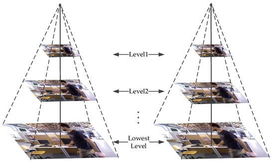 The dense pyramidal optical flow method is applied to detect dynamic regions in images. By building a dense two-dimensional optical flow field on the image, richer motion information in the image is obtained. In motion scenes, if the speed of dynamic objects is too fast, the difference between the two images is more obvious, and the single-layer optical flow can easily reach the local optimum and cannot be tracked correctly. The same image is scaled by image pyramids to obtain images at different resolutions, as shown in Figure 4. When calculating the optical flow, the result of the optical flow calculated in the previous layer is used as the initial value of the optical flow in the next layer. By calculating the optical flow in this coarse-to-fine way, the effect of object motion uncertainty on the optical flow can be effectively solved, and the results are shown in Figure 5b. After obtaining the optical flow field, the Munsell color system [34] optical flow is used to interpolate Figure 5b, and the results are shown in Figure 5c. To determine the dynamic regions in the image, a dynamic optical flow threshold θ is defined. The region where the optical flow amplitude is higher than is considered as a moving region. On the contrary, the optical flow amplitude in the static region is lower than . The optical flow fields are binarized using , as shown in Figure 5d. The optical flow amplitude is defined according to Formula (1).