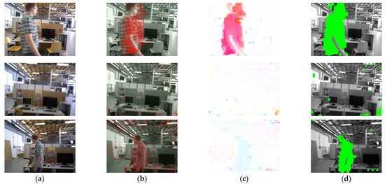 Dynamic region detection. (a) Original image; (b) Dense optical flow field; (c) Mendelian chromatic interpolation optical flow field; (d) Binary optical flow field.