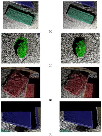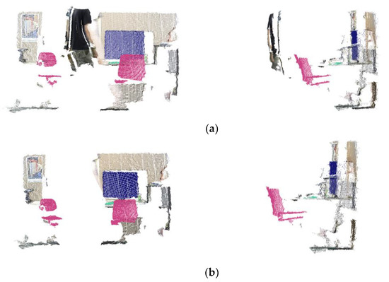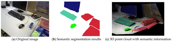 The depth camera can provide color and depth images. The two-dimensional image and semantic information of each key frame can be mapped to a three-dimensional point cloud based on the camera internal parameters, as shown in Figure 7. However, due to the over-segmentation problem in obtaining the semantic information of the image, the semantic information in two dimensions is mapped to the three-dimensional point cloud with large deviations, as shown in Figure 7c. Therefore, a region growing algorithm with depth information is given to optimize 3D semantic annotation, as shown in Table 1. As shown in Figure 8, the accuracy of optimized 3D semantic annotation by the algorithm in Table 1 has significantly improved.