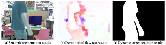 - Motion detection module. It calculates the homography of the current color image frame and the previous image frame. Then, the image of the current frame is transformed using the homography, and the optical flow field is calculated using the dense optical flow method. Finally, the dynamic region for the tracking module is obtained based on the optical flow field. In addition, the semantic masks are combined with the dynamic regions to acquire the dynamic targets for the map building module.