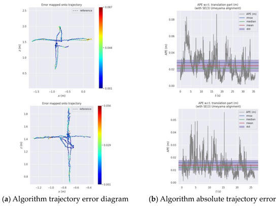 In order to verify the experimental results, the results of the experiments are evaluated by the following two criteria: absolute trajectory error (ATE) and relative pose error (RPE). ATE is defined as the error between the true trajectory and the estimated trajectory of the SLAM, calculated by Equation (6). RPE is defined as the error between the true position transformation and the position transformation estimated by SLAM within a certain period of time, calculated by Equation (7).