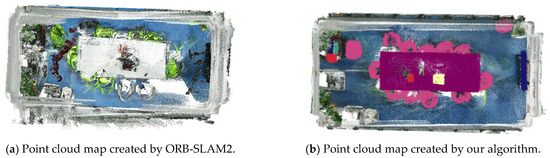 In addition to the TUM RGB-D dataset, we also compared our algorithm with the open-source ORB-SLAM2 in a real environment. In the real environment, we add constantly moving pedestrians used to interfere with SLAM. The point cloud map of the dynamic environment constructed by ORB-SLAM2, and our algorithm is shown in Figure 12, Figure 13 and Figure 14. Affected by the dynamic object, the pose estimation of the camera had large errors, as shown in Figure 13a. When the map was constructed, point cloud information was mapped to the wrong location. Meanwhile, the information of dynamic objects is also retained in the map, as shown in Figure 13. Compared to ORB-SLAM2, our algorithm greatly improves these drawbacks. In scenes with dynamic objects, our algorithm is able to estimate the pose and construct the map very well. In addition, the algorithm is also able to obtain semantic maps while perfectly removing dynamic objects, as shown in Figure 13a,b.