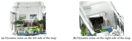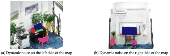 Aiming to remove dynamic objects from the local maps, the motion regions in the images obtained in Section 3.3 are used to determine whether the semantic masks in the BiSeNet V2 network are dynamic object masks. Specifically, the proportion of dynamic regions in each semantic mask is first calculated according to Equation (5). if is higher than the threshold , the semantic mask is determined to be dynamic, otherwise it is static, as shown in Figure 9. Then, the local three-dimensional semantic map is generated after removing the dynamic object mask areas in the color image and depth image, as shown in Figure 10. Each frame of the point cloud can be concatenated to form a global map based on the pose information. Finally, the global map is optimized to generate an accurate 3D semantic map based on loopback detection and global BA in ORB-SLAM2.