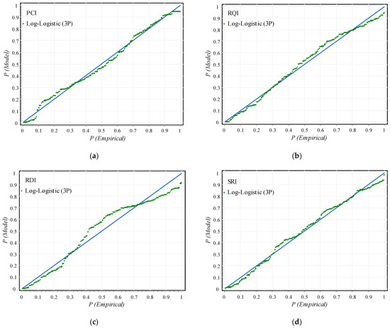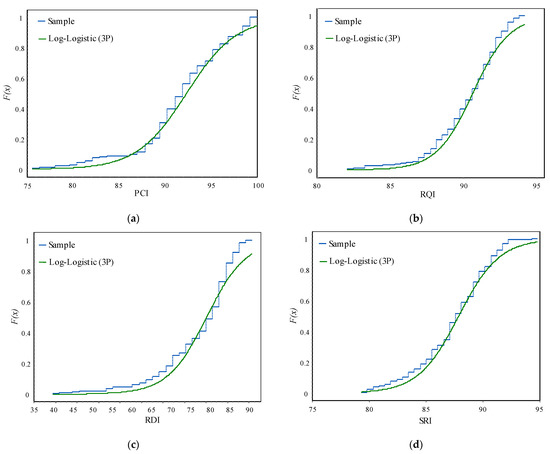 In this study, several probability distributions, including Normal, Log-Logistic, Log-Logistic (3P), Logistic, and Lognormal, were used to analyze the probability distribution characteristics of the evaluation indexes. By employing different probability functions [30], probability distribution characteristics of the pavement performance evaluation indexes were determined.