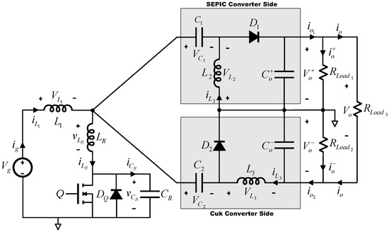 Table 1 summarizes the voltages and currents for the main components of the bipolar output ZVS-QR SEPIC–Cuk combination converter in terms of input voltage (Vg), the conversion parameter m and loads , and .