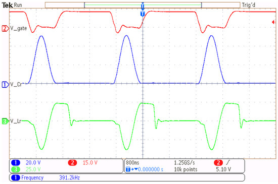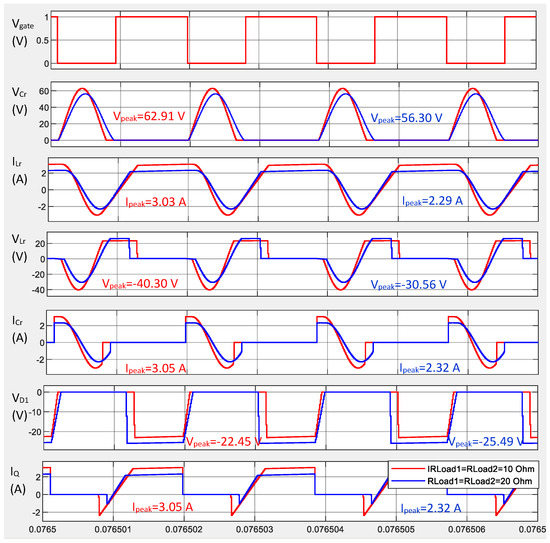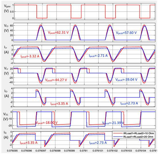 The ZVS-QR SEPIC–Cuk combination converter has been analyzed using a simulation model, first in step-down mode. The waveforms shown in Figure 7 correspond to a simulation with and , first with 10 Ω and then with 20 Ω (where the resonant action is maintained in both cases with Vg = 14 V). This has allowed us to check the intervals’ duration, the peak and average values of the resonant waveforms, the current and the voltage, provided by (2)–(6), for the specified load range and the following variables: voltage in the gate terminal (VGate), resonant inductor current (), resonant capacitor voltage (), resonant inductor voltage (), resonant capacitor current (), freewheel diodes voltage ( and ) and current through the MOSFET (iQ).