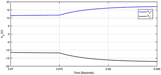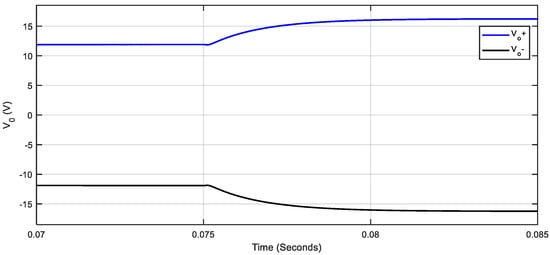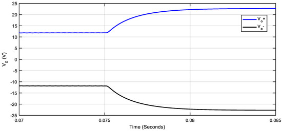 In the same way, the results shown in Figure 8 correspond to Vg = 14 V, and of 10 Ω, but with a change in the switching frequency from 411 kHz to 200 kHz at 0.075 s. In this case, due to the change in frequency, the output voltages vary between ±11.8 and ±22.7 V, and there is a change in the converter operation from step-down to step-up mode. In addition, the results shown in Figure 9 also correspond to Vg = 14 V, with a switching frequency of 411 kHz, but with a change in and from 20 Ω to 10 Ω also at 0.075 s. As a result, the output voltages vary between ±11.7 and ±17 V, and the converter also changes operating mode (from step-up to step-down), but now due to the change in the load.
