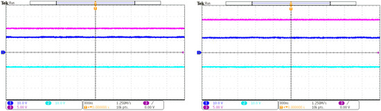 ZVS-QR SEPIC–Cuk converter in step-down and step-up modes for an input voltage of 10 V (on the left) and 14 V (on the right): SEPIC-side output voltage (Channel C1: 10 V/div, 0 V offset), Cuk-side output voltage (Channel C2: 10 V/div, 0 V offset) and input voltage (Channel C3: 5 V/div, 0 V offset).
