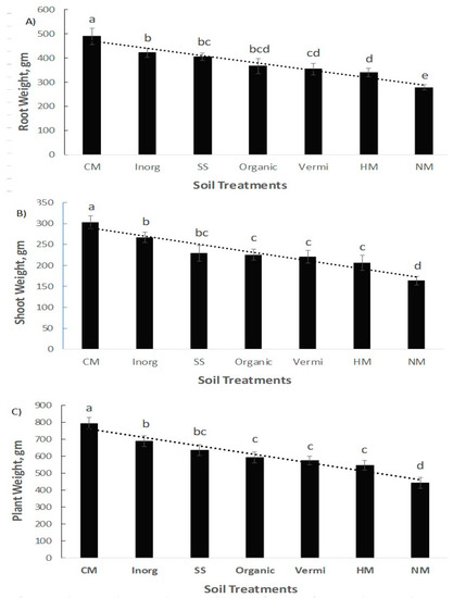 Overall average weight (n = 3) ± standard deviation of turnip root (A), shoot (B), and weight of turnip plants (C) collected at harvest under seven soil treatments, regardless of turnip variety. Statistical differences were accompanied among seven soil treatments for each plant part or total weight. Bars with dissimilar letter(s) indicate significant variances at p ≤ 0.05 using Duncan’s multiple range test in SAS [26].