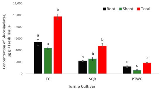 Concentrations of glucosinolates in roots, shoots, and whole plant of three varieties of turnips, Brassica rapa Tokyo Cross (TC), Scarlet Queen Red SQR), and Purple Top White Globe (PTWG) grown under field conditions, regardless of soil amendment type. Statistical analysis was conducted among three varieties using Duncan’s multiple range test in SAS [26]. Values with different letters reveal statistical differences at p ≤ 0.05.
