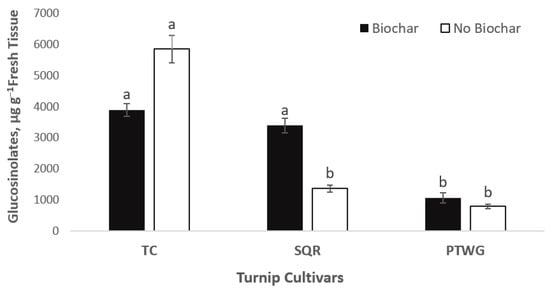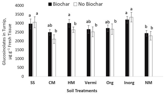 The overall concentration of glucosinolates in turnip, Brassica rapa grown under soil treatments amended and not amended with biochar, regardless of crop varieties. Statistical analysis was performed among crop varieties via Duncan’s multiple range test in SAS [26]. Values with the same letter(s) indicate no significant differences (p ≥ 0.05).