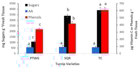 Concentrations of soluble sugars, AA (vitamin C), and total phenols in three commercial varieties of turnip, Brassica rapa Tokyo Cross (TC), Scarlet Queen Red SQR), and Purple Top White Globe (PTWG), irrespective of treatments. Statistical analysis was performed among turnip varieties via Duncan’s multiple range test in SAS [26]. Values with the same letter(s) indicate significant differences (p ≥ 0.05).