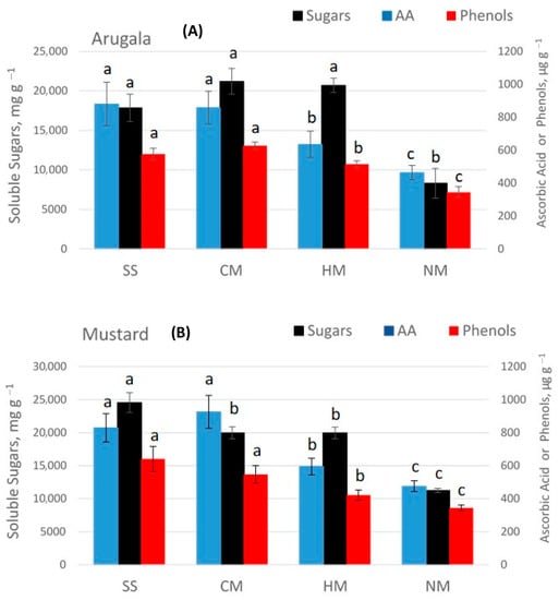 Concentrations of soluble sugars, ascorbic acid (AA), total phenols ± std. error in arugula (A) and mustard (B) grown under different soil management practices. Statistical analysis comparisons were carried out among four soil treatments of each parameter. Statistical analyses were done via Duncan’s multiple range test in SAS [26]. Values with the same letter are not significantly different (p ≥ 0.05).