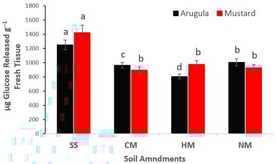 GSLs concentrations in mustard shoots were larger (1424 µg g−1 fresh shoot) compared to arugula shoots (1250 µg g−1 fresh shoot). This might be due to the greater proportion of the above-ground biomass of mustard related to arugula biomass. SS mixed with native soil elevated the concentration of GSLs in arugula and mustard shoots from 1006 and 927 µg−1 fresh tissue in NM native soil to 1250 and 1424 µg−1 fresh tissue, respectively (Figure 8), whereas GSLs in arugula and mustard shoots of plants grown in CM or HM amended soils were significantly lower compared to SS amended soil. Kleinwachter and Selmar [60] described a remarkable activity of the enzyme myrosinase (glucosidase) by ascorbic acid and in some situations, myrosinase is entirely inactive in the absence of ascorbic acid.