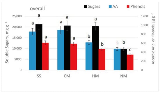Overall concentrations of soluble sugars, ascorbic acid, and phenols ± std. error under four soil management practices (sewage sludge, SS; chicken manure, CM; horse manure, HM; and no manure, NM), regardless of crop type. Statistical analysis was performed among four soil management practices. Values with the same letter are not significantly different (p ≥ 0.05).