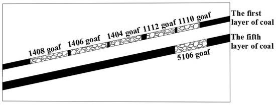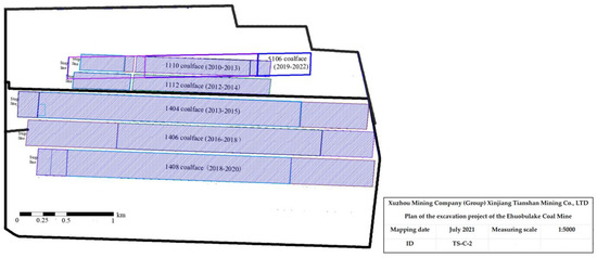 The Ehuobulake Coal Mine is located in Agge Township, Kuqa County, Xinjiang Uygur Autonomous Region. The geographical coordinates of the central point of the mining area are 82°59′26″ E longitude and 42°12′43″ N latitude. The identified coal resources amount to 229.54 billion tons, and the predicted coal resources amount to 1668.2 billion tons. Currently, the annual coal production is about 7.5 million tons. The approved mine production scale is 4.00 Mt/a, and the designed production capacity after the mine reconstruction and expansion is 7.50 Mt/a. The mining area is about 8.63 km long from east to west, 3.83 km wide from north to south, and 33.0495 km2 in area. The elevation of the mining area is about +1910 m, and the relative elevation difference is about 100 m. The eastern terrain is undulating due to gully cutting, the western part is hilly, surrounded by mountains, and the central part is flat. The Ehuobulake Coal Mine mainly mines the first and fifth layers of coal. The thickness of the first layer of coal is 3.11–4.16 m, the dip angle is 11°, and the buried depth is about 290 m; the distance between the fifth layer of coal and the first layer of coal is about 60 m, the thickness is 7.0–10.4 m, the dip angle is 12.5° on average, and the buried depth is about 350 m. The comprehensive mechanized coal mining method of moving to the longwall is adopted, using a collapse management roof. The distribution of working faces in the research area is shown in Figure 1.