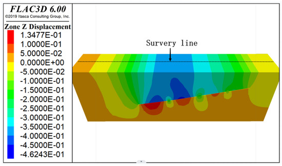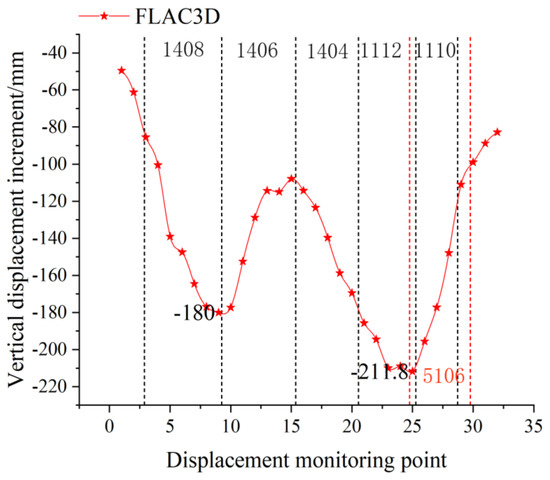 The vertical displacement of overlying rock stratum after working conditions 1 and 2 is shown in Figure 4a,b. The ground vertical displacement is shown in Figure 5, and the ground vertical displacement increment caused by mining on working faces 1408 and 5106 is shown in Figure 6. As can be seen from Figure 4a, the vertical displacement of the ground presented obvious asymmetry due to the coal seam dip angle, and the advance influence range on the left side of the 1408 mined-out area was larger than the advance influence range on the right side of the shallow 1110 mined-out area. Under working condition 1, the maximum vertical displacement of overlying rock appeared near the mined-out area of the 1404 working face. The maximum vertical displacement of ground appeared above the mined-out area of the 1404 working face and 1406 working face, and the displacement amount was −350 to −400 mm. The range of surface settlement was obviously larger than the mining scale of underground working face. As can be seen from Figure 4b, the maximum vertical displacement of the overlying rock appeared near the mined-out area of the 1406 working face under working condition 2. The maximum vertical displacement of the ground appeared above the mined-out area of the 1406 working face, the displacement amount was −550 to −600 mm, and the range of ground settlement was further increased. It can be seen from Figure 6 that mining in the 1408 and 5106 working faces resulted in two obvious settlement funnels on the ground. The maximum displacement in the center of the settlement funnels was −180 and −211.8 mm, respectively.
