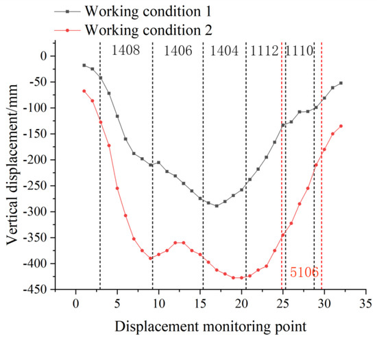 Vertical displacement of the overlying rock under different working conditions: (a) working condition 1; (b) working condition 2.