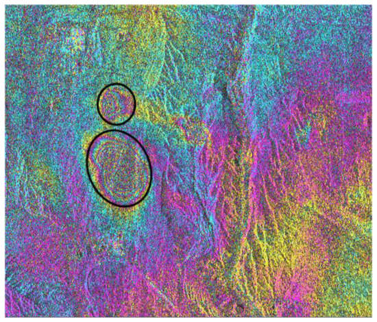 The SBAS-InSAR processing strategy yielded 458 interferograms. The topographic phase in the interferogram was filtered by external DEM. The interferogram was filtered using the Goldstein algorithm to reduce the coherence noise, and the corresponding coherence coefficient diagram was obtained. Using the high-coherence points in the obtained diagram, the phase unwrapping was realized through the minimum cost flow (MCF) algorithm, and the images with a poor unwrapping effect were removed, thus obtaining the filtered interferogram. In Figure 9, one out of 458 interferograms is shown. Two active areas are clearly identified in this interferogram, represented by closed circular shaped fringes. The location of these active areas (subsidence basins) corresponds to the location of coal mining areas, suggesting a clear relationship between the mining activity and measured deformation.
