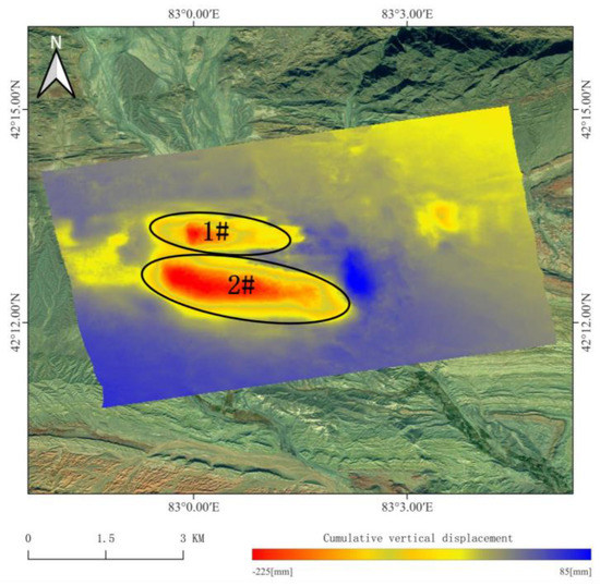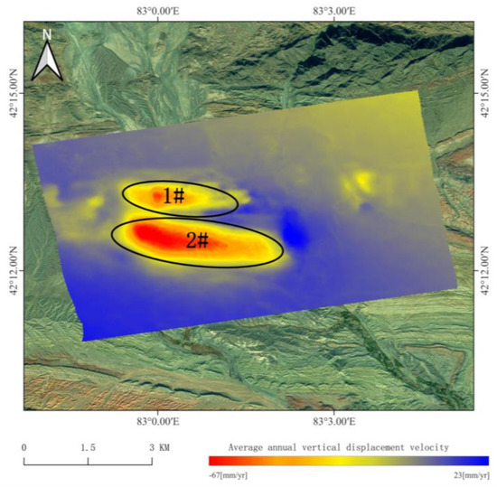Figure 10 and Figure 11 respectively show the cumulative vertical displacement and ground-level annual average vertical displacement speed situation in the Ehuobulake Coal Mine area from 1 January 2019 to 6 September 2022 obtained via the application of SBAS-InSAR technology. Displacement quantity is represented by different colors, the negative value indicates the land subsidence, the positive value indicates the land uplift, and a deeper color denotes greater vertical displacement. As can be seen from Figure 10, two obvious deformation regions (1# and 2#) appear in the study area during the study period. The maximum vertical displacement in the study area is −225 mm, which occurs in the 2# deformation region. As can be seen from Figure 11, the maximum vertical displacement velocity in the mining area is −67 mm/a, which occurs in the 2# deformation region.