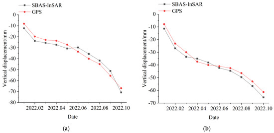 SBAS-InSAR versus GPS vertical displacement: (a) GPS station 1; (b) GPS station 2.